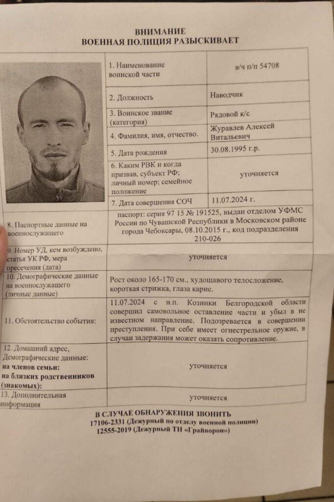Tại khu vực Belgorod, một binh sĩ đào ngũ đã bắn chết các đồng đội và trốn thoát khỏi nơi đóng quân. Chính quyền địa phương đã triển khai kế hoạch “Truy bắt”. Các lực lượng quân sự và an ninh đang tìm kiếm Alexey Zhuravlev, 29 tuổi, từ Chuvashia, người đã bắn chết các đồng đội của mình. Thông tin về vụ việc được truyền tải trên một số kênh Telegram của Nga, trong khi chính quyền và truyền thông trung ương giữ im lặng.